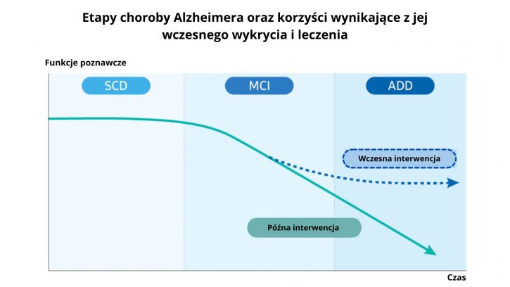 Liczne badania wykazują, że zmiany w mózgu mogą zacząć zachodzić już na 10 do 20 lat przed pojawieniem się spowodowanej chorobą Alzheimera demencji.[3] Dlatego też wykrycie owych wczesnych objawów ma kluczowe znaczenie. Choć najnowsze osiągnięcia medycyny zwiększyły nadzieje na opracowanie skutecznej terapii, to wczesna diagnoza – w połączeniu z długoterminową opieką – nadal pozostają najbardziej efektywnym, znanym dzisiaj rozwiązaniem.