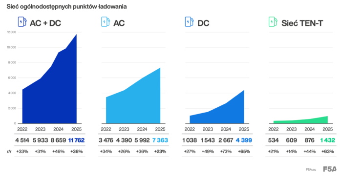 Nie tylko auta – ładowanie też poszło do przodu. Ogólnodostępnych punktów AC+DC: 11 762 (+36% r/r), z czego DC rośnie szybciej (4399, +73%). Na sieci TEN-T (autostrady, eSki) wzrost o 63%. Nowo uruchomione: 3103 punkty (+14%), po raz pierwszy DC wyprzedziło AC w nowych instalacjach. Game changer? Huby ładowania (co najmniej 4 punkty 150 kW+ w jednej lokalizacji)! 95 hubów (+216%), 475 stacji (+346%), 638 punktów (+286%).