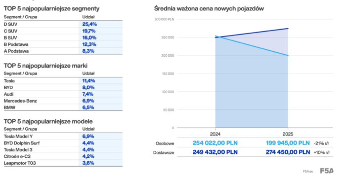Kto królował? Tesla z 11,4% udziałem – Model Y (6,9%) i Model 3 (4,4%) to hity. Ale uwaga: BYD na drugim miejscu (8,0%) z Dolphin Surf (4,4%) – chiński gracz zrobił furorę niskimi cenami. Dalej Audi (7,4%), Mercedes-Benz (6,9%) i BMW (6,5%). Top modele to jeszcze Citroën e-C3 (4,2%) i Leapmotor T03 (3,6%). Segmenty? SUV-y rządzą: D SUV (25,4%), C SUV (19,7%), B SUV (16,0%). Ciekawostka: W UE Tesla straciła pierwsze miejsce na rzecz Volkswagena, a BYD dopiero raczkuje. U nas chińskie marki wyciągnęły max z programu „NaszEauto” – dopłaty + niskie ceny = sukces.